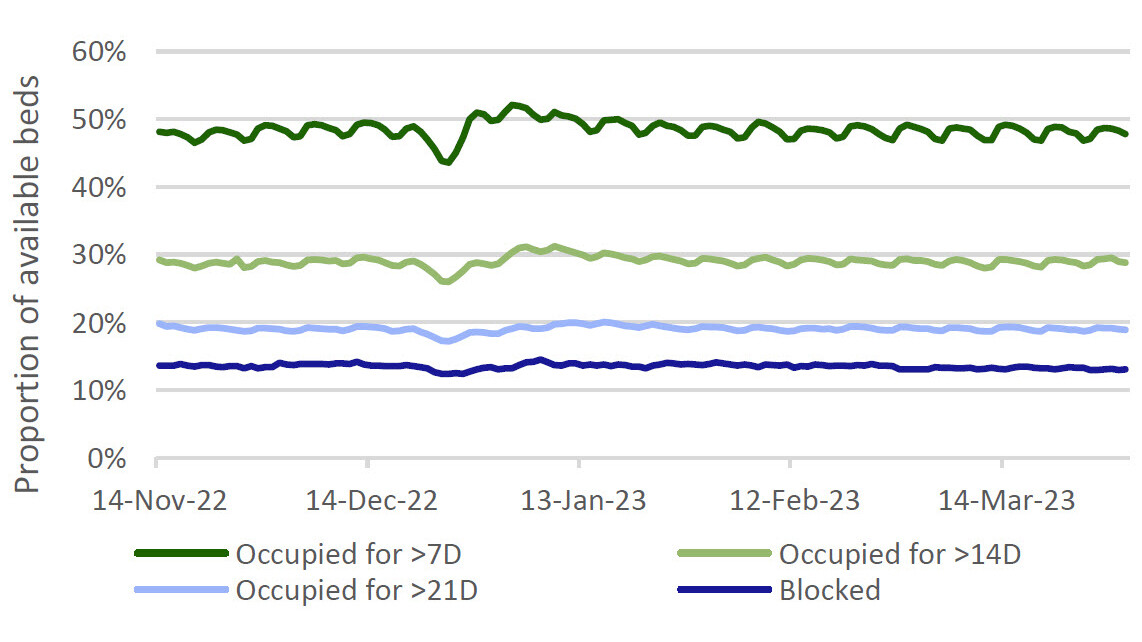 This chart tells us nothing about who is in these beds and one more level of granularity paints a very different picture. Figure 6 below shows proportional occupancy for longer periods and also beds that are blocked (this is when the patient is considered to be safe for discharge into the community with suitable support, but where such support is not available).
