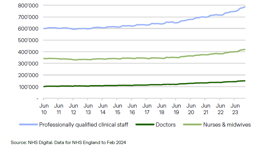The chart shows a compound annual growth rate of 2% per annum overall and 3% p.a. for doctor numbers since the Conservative-led coalition of 2010 took power. Indeed, the NHS has added 7,500 ‘new’ doctors in the past 12 months, so pledges to add a further 8,000 of one sort or another during the next five-year election cycle may seem essentially meaningless in terms of capacity overall. The majority of the net additions have been in the higher grades (consultant, specialist) too.