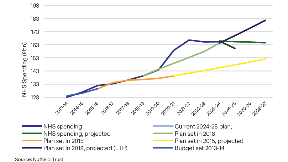 On the funding side, it commits to £7bn in additional annual funding, but this is only a 4% increase on the 2024/25 base. The budget was £155bn in 2022/23 (the last actual year) and has increased at a CAGR of 3.1% over the past two years. As such, this increase is not a meaningful sum and, as illustrated previously, still represents a material real-terms shortfall versus the planned budget from 2018. This might be more spending, but it is still a worse NHS than was promised before the pandemic.